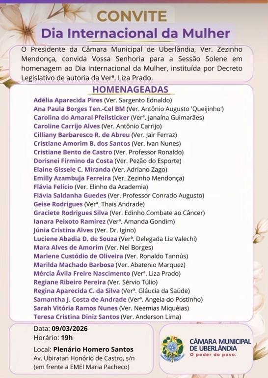 Durante a solenidade, o Poder Legislativo prestará homenagem a mulheres que se destacam em diferentes áreas de atuação e que representam a força, a dedicação e o protagonismo feminino em Uberlândia. A iniciativa é realizada com base no Decreto Legislativo nº 001/97, de 27 de fevereiro de 1997, de autoria da vereadora Liza Prado.