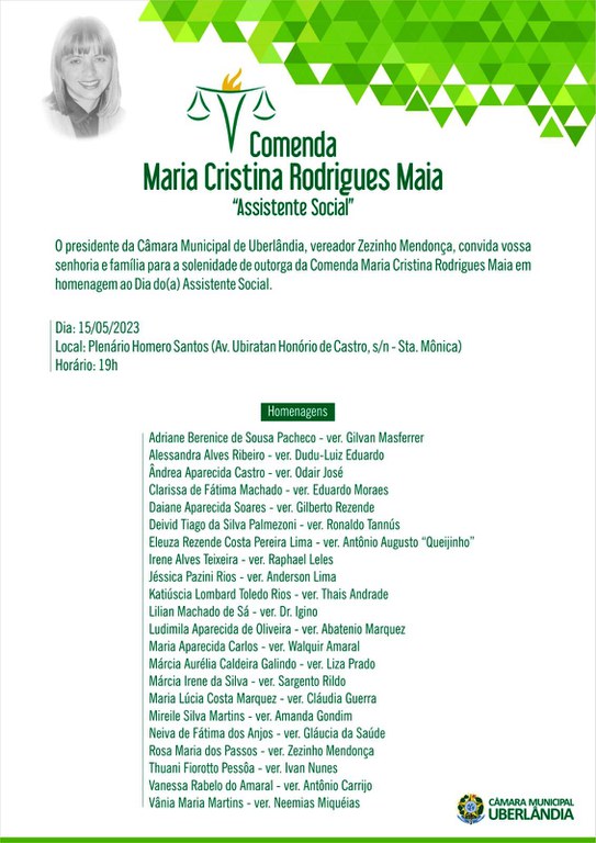 O evento, que será conduzido pelo presidente da Casa, vereador Zezinho Mendonça (PP), homenageará 22 profissionais (veja relação acima) que receberão a “Comenda Maria Cristina Rodrigues Maia”, - “uma homenagem póstuma à grande profissional que foi a assistente social. Ela dedicou parte de sua curta existência entre nós para melhorar a qualidade de vida de todos, principalmente dos idosos. Hoje, quando se fala em trabalho social, o seu nome é sempre lembrado” - será transmitido ao vivo pela TV Câmara, canal 9.3 e pelo YouTube: https://www.youtube.com/@UberlandiaCamara