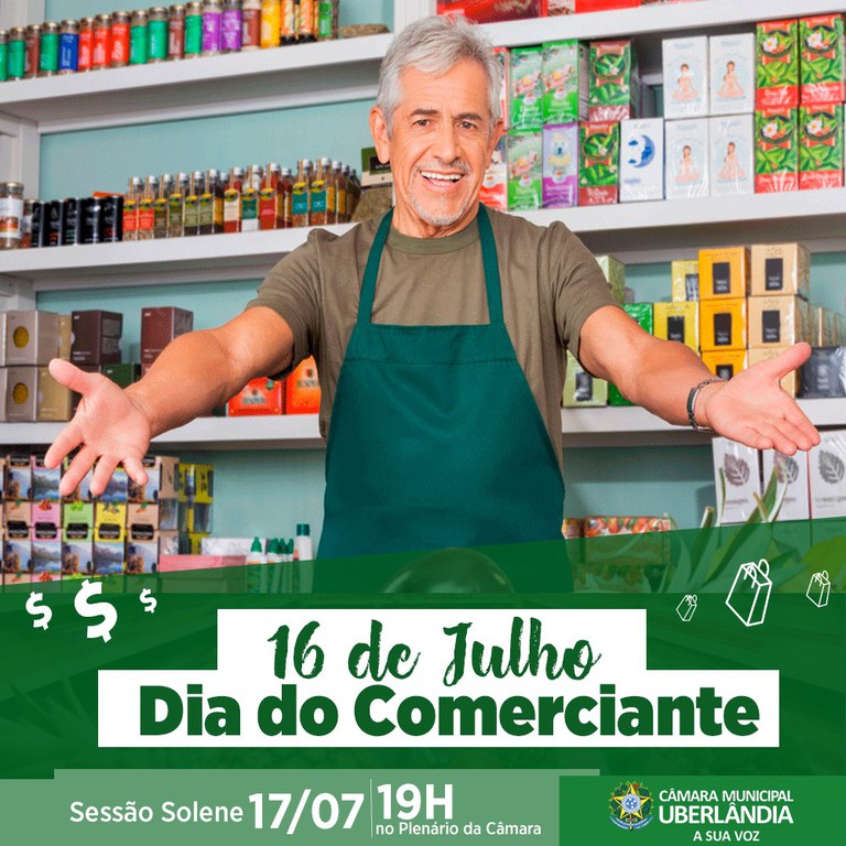 A Câmara Municipal de Uberlândia irá comemorar com uma sessão solene, excepcionalmente às 19h desta quarta-feira (17), o Dia do Comerciante, em função ao ponto facultativo hoje em Uberlândia devido ao Dia da Padroeira da cidade, Nossa Senhora do Carmo. Na solenidade, vereadores estarão outorgando diplomas a profissionais que trabalham na área do comércio em nossa cidade e que geralmente trabalham vendendo algum tipo de produto.