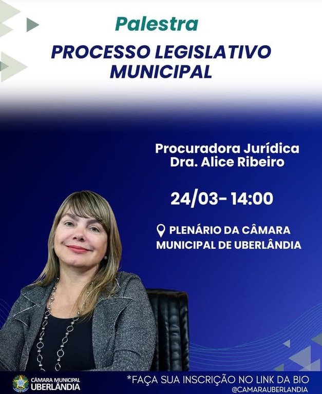A Câmara Municipal de Uberlândia realiza na tarde desta terça-feira (24), às 14h, uma palestra especial com a Procuradora Jurídica Dra. Alice Ribeiro Ferraz, uma das maiores referências da cidade em Direito Público e Processo Legislativo Municipal.