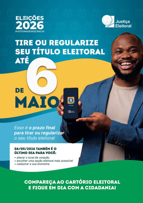 A Justiça Eleitoral lembra: o cadastro eleitoral fecha em 6 de maio. Até lá, é possível emitir o primeiro título, transferir domicílio, atualizar dados ou regularizar pendências. Após essa data, nenhuma alteração poderá ser realizada até o término das eleições de 2026.